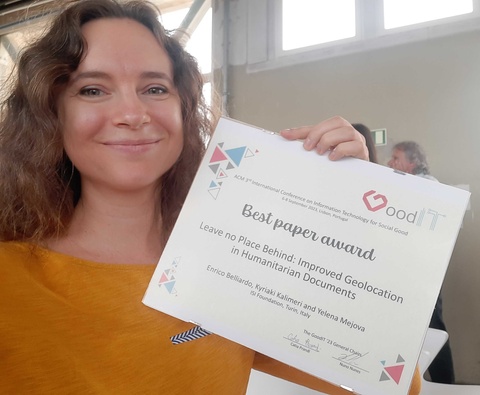 Relatedly, in Sept. '23, Mejova et al. received a Best Paper Award at ACM GoodIT for "Leave no Place Behind: Improved Geolocation in Humanitarian Documents" related to her work with the DEEP project.