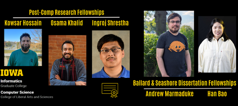 Fellow doctorate students Kowsar Hossain (CS - 6th year) and Osama Khalid (CS - 5th year), and Ingroj Shrestha (CS - 6th year) have received Graduate College Post-Comprehensive Research Fellowships for Spring 2024.