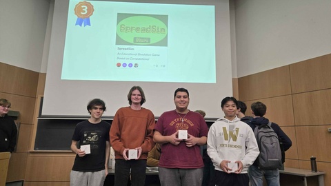 In November 2024, undergraduate students (3rd year computer science and music major) Eric Newton*, (3rd year computer science major) Fin Deevy, (2nd year computer science major) Kyle Chi, and (3rd year computer science and linguistics major) Nick Theuerkauf participated in Swan Hacks, securing third place with their creation of SpreadSim. The team set out to develop a project that went beyond the standard website or AI bot, drawing inspiration from Dr. Segre's talk on computational epidemiology on how infections spread throughout the hospital and implemented Agile methodology from Introduction to Software Development taught by Dr. Goddard.