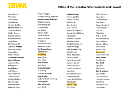 "THE GRADUATING CLASS OF 2025 recognizes these UI faculty and staff members for making a positive difference in their lives during their time at the University of Iowa. President Barbara Wilson, Executive Vice President and Provost Kevin Kregel, and Vice President for Student Life Sarah Hansen join in thanking all the faculty and staff members who work every day to make a difference for our students. And congratulations to the class of 2025!"